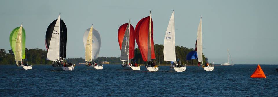 Firstit startin jälkeen. Kuva Harri Hansen.Myötätuulta riitti aina Kotkan portille asti, jonne fleet tuli melko hyvin koossa Mélisanden johdolla, PenelopeSilver Girl sekä muu veneet takanaan. Suursaaren itäpuolella syntyikin eroja, kun haasteelliset tuulet sekoittivat sijoituksia ja tarjosivat mielenkiintoisen taktisen lisän.