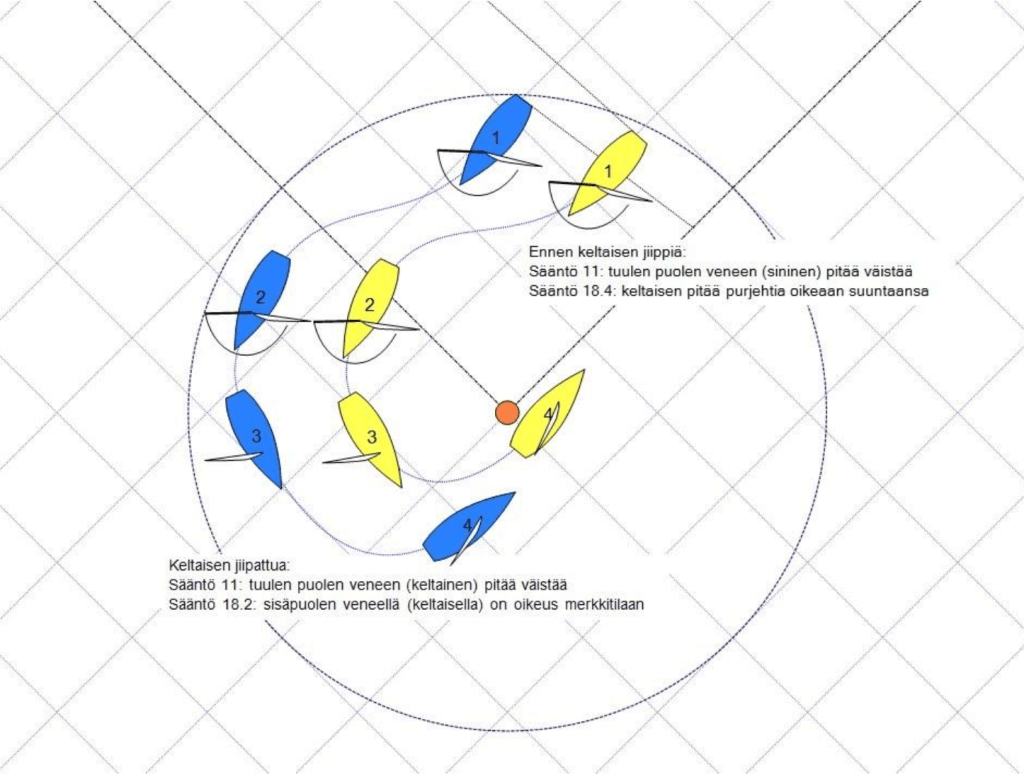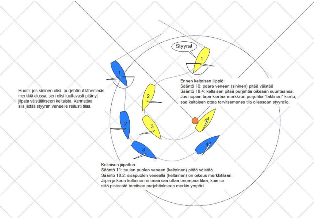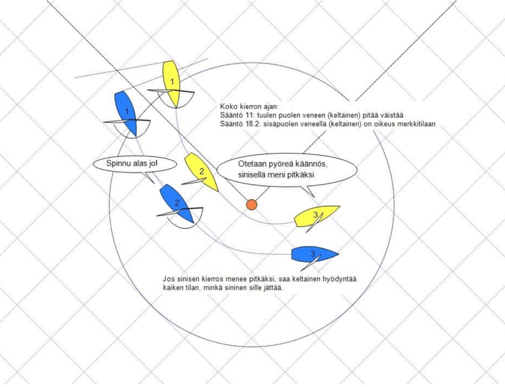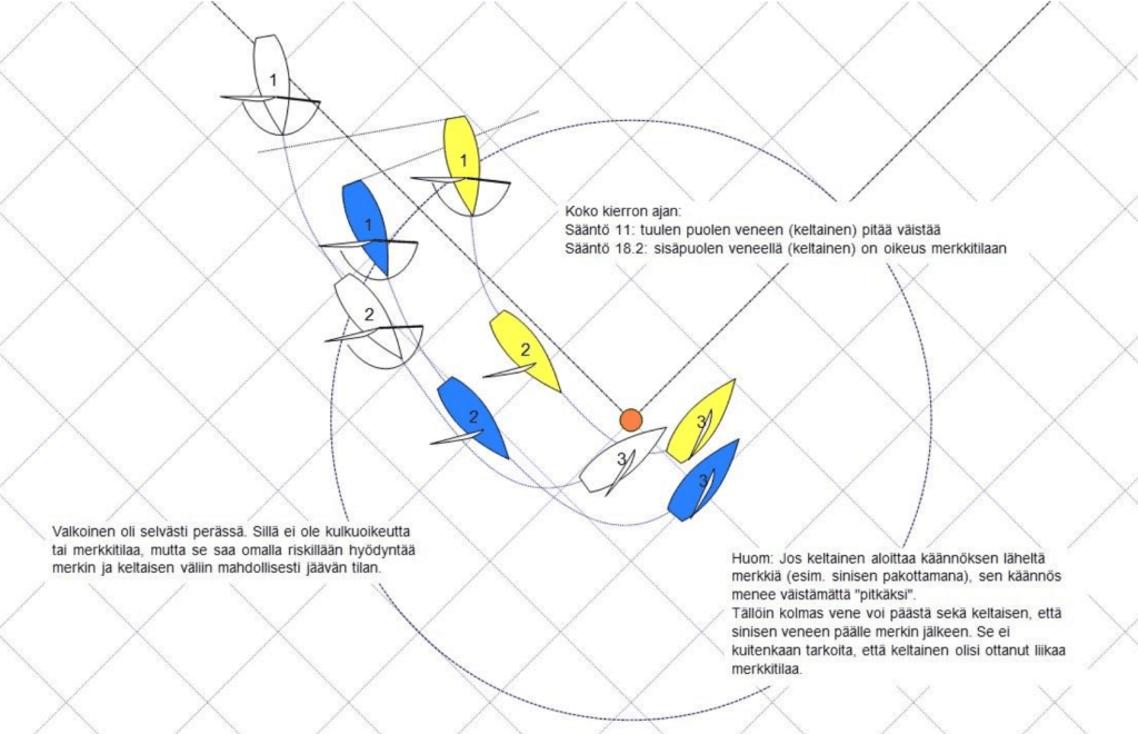 Tilanteet jäivät askarruttamaan minua sen verran, että päätin tutustua sääntöihin tarkemmin. Mitkä säännöt ovat voimassa alamerkin kierron eri vaiheissa? Tarkastelua varten jaoin merkin kierron karkeasti kolmeen vaiheeseen: lähestyminen, merkillä, poistuminen. Lisäksi keskityin vain First 31.7 -ratakisoissa käytettävään kryssi/lenssi-rataan ja kahden veneen tilanteisiin.