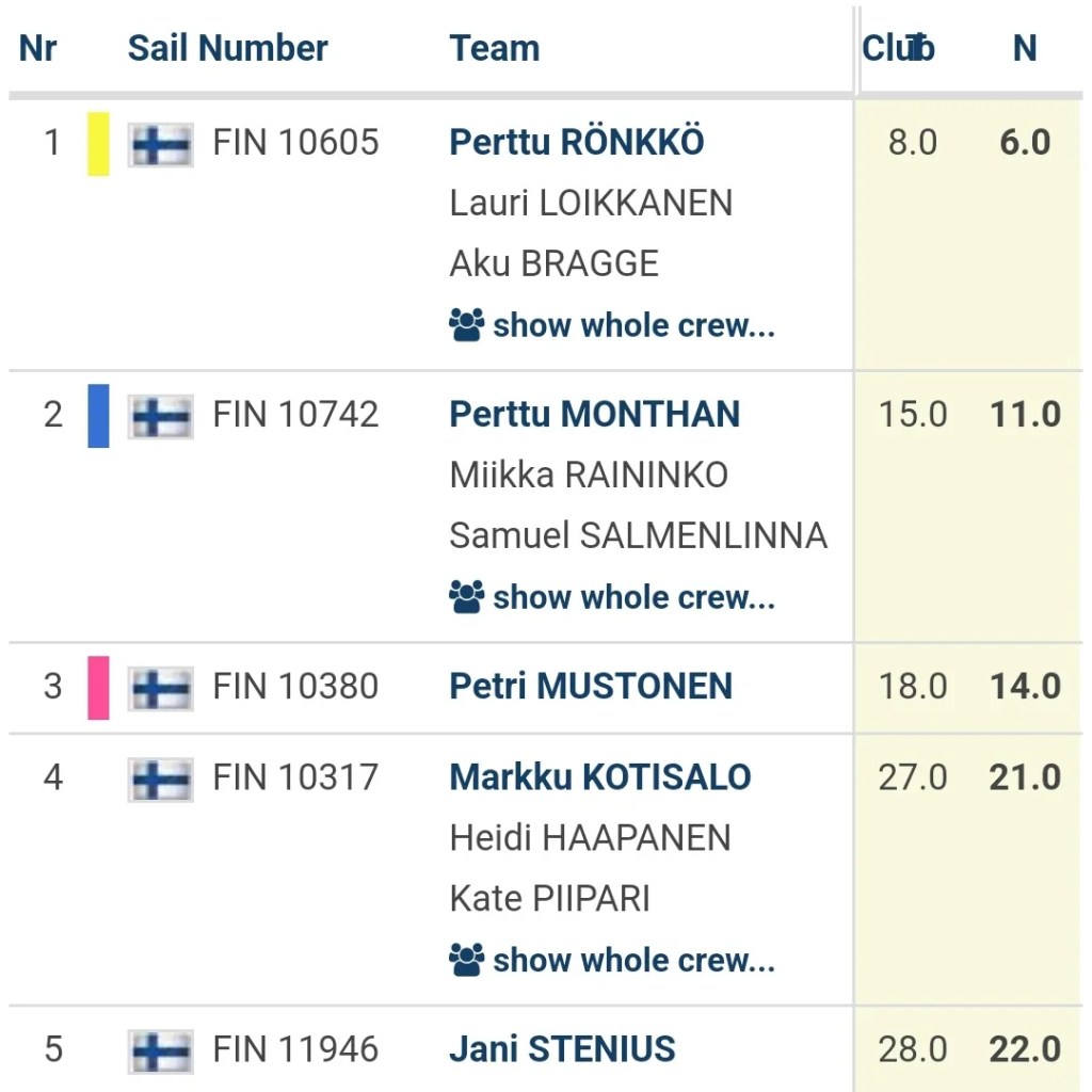 Luokka sai hyvin tuulen juonesta kiinni toisen kisapäivän aikana ja merkkitilanteista tuli todella tiiviitä. Lähtövoitot sunnuntaina ja samalla SM-kullat vei Penelope. Thetis purjehti hopeamitaleille ja Lutra Lutra pronssimitaleille.